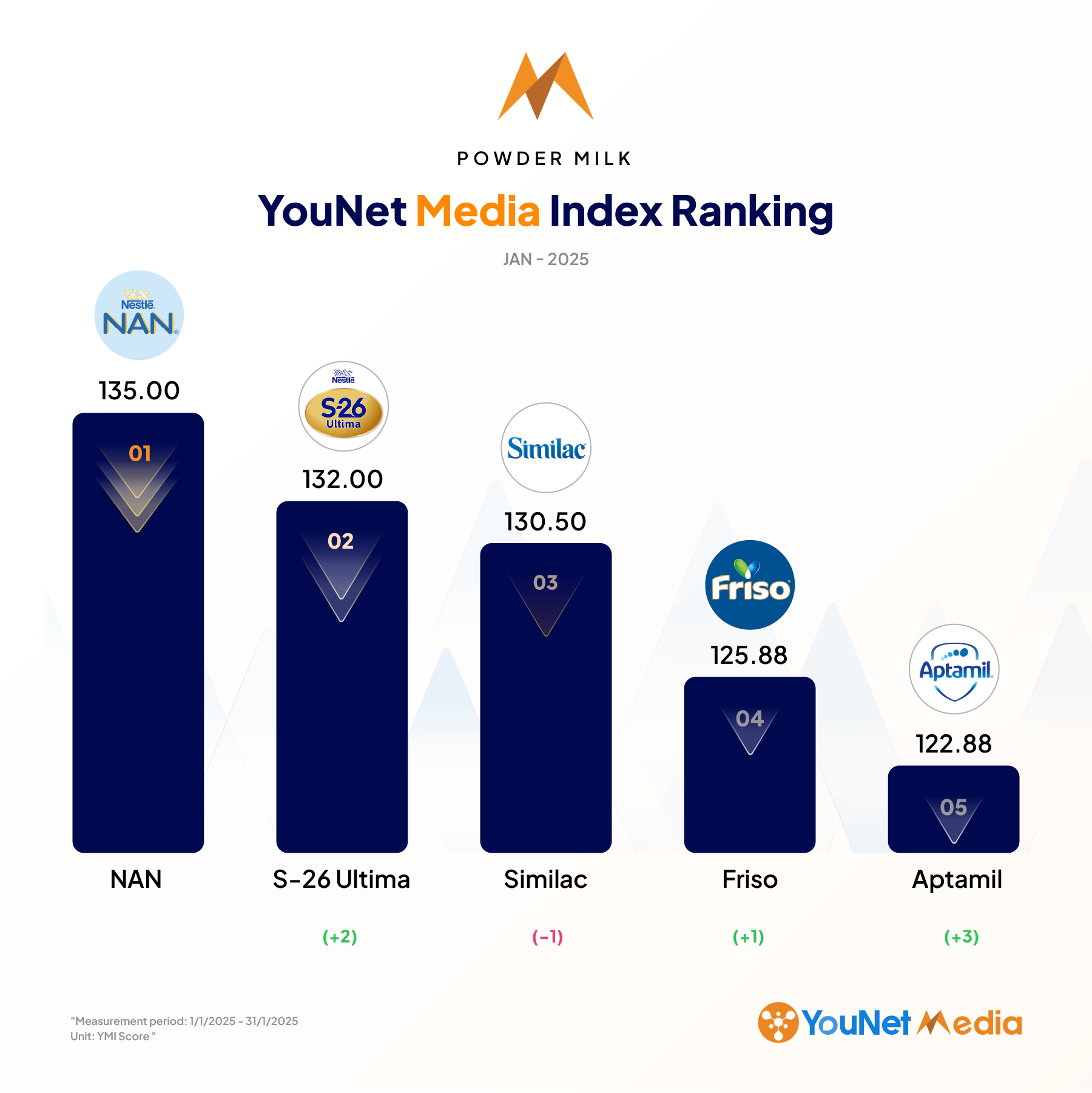 The powdered milk segment saw an increase in engagement at the beginning of the year, recording 1.3 million mentions, a 22% rise compared to the previous month. The Top 5 brands in the YMI January 2025 Ranking were NAN, S-26 Ultima, Similac, Friso, and Aptamil.